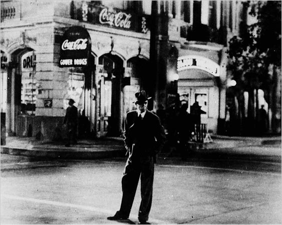 The scene happens during the part when Jimmy Stewart’s character is running through the main street of Pottersville. On either side drinking and dancing establishments flash their attractions and burlesque shows offer a peek at a titillating sight. On the left hand side of the street, just up a bit, you will notice a huge, lit Coca-Cola sign on which the camera stays just a bit too long. The sign actually competes for frame a bit with the hero!